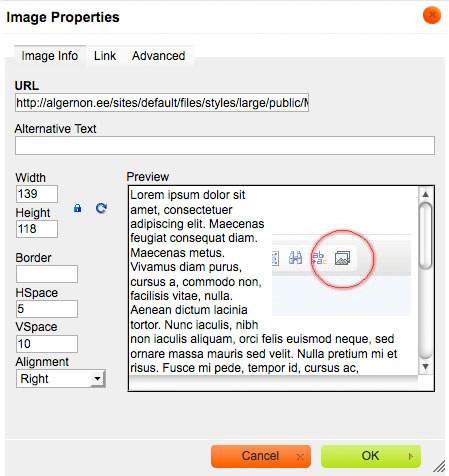 Sinna nupule vajutamise peale tuleb lahti nn media browser ja saad kas oma arvutist pildi üles laadida või kasutada juba serveris olevaid pilte. (Upload on arusaadavalt failide üleslaadimiseks oma arvutist, Library näitab faile serveris.) Faili mõõduks on vaikimis 'large', soovitan selle jätta, kui ei ole vajadust väiksemaks teha. 'Description' tuleb vaikimisi failinimi, selle asemel võib (aga ei pea) midagi mõistlikumat kirjutada. Edasi tuleb sisestatud pilt panna õigesse kohta. Topeltklõps pildil (mõnikord on mõni brauser tahtnud paremat klõpsu ja siis escape ja siis jääb alles väiksem aken, kust tuleks valida edit image) ja peaks avanema selline aken -->